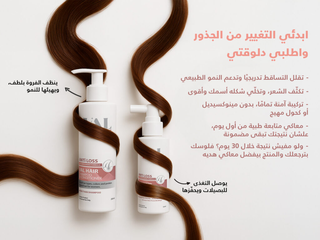 تساقط الشعر وقت الحمل والرضاعة؟ طبيعي يحصل… بس ماينفعش تسيبيه يزيد. التغيّرات الهرمونية بتضعف الشعر، وتخليه يتساقط بشكل ملحوظ، خصوصًا مع الإرهاق وقلة التغذية. مجموعة VAL بتركيبتها الطبيعية 100% بتغذّي فروة الرأس، تقوّي الجذور، وتدعم نمو بصيلات جديدة بشكل آمن تمامًا. من غير أي كيماويات ضارة – وآمنة خلال الحمل والرضاعة. علشان تعتني بنفسك… من غير خوف.